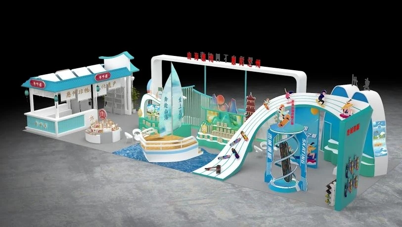 展臺(tái)主體結(jié)構(gòu)為“游輪”與滑板賽道創(chuàng)意,新穎獨(dú)特且具視覺(jué)沖擊效果;設(shè)計(jì)的滑板體驗(yàn)區(qū)使整個(gè)展臺(tái)更加靈動(dòng)而流暢,凸顯文旅體融合發(fā)展的主題;中心地面以藍(lán)色海洋發(fā)光地面為亮點(diǎn),科技、時(shí)尚,契合惠州獨(dú)有的海洋優(yōu)勢(shì)。