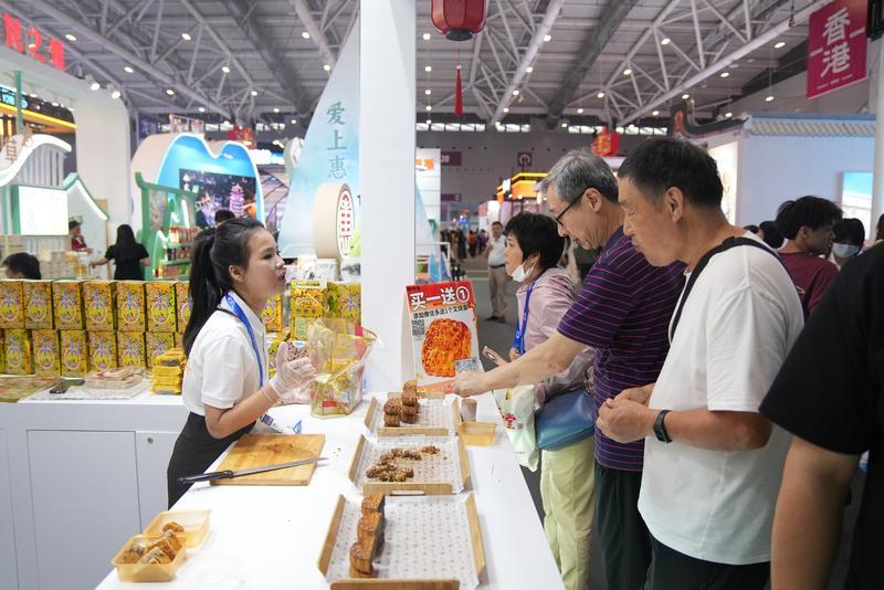 惠州館內(nèi),游客在郭師傅月餅展位前駐足品嘗;葜萑請笥浾吡_劍業(yè) 攝
