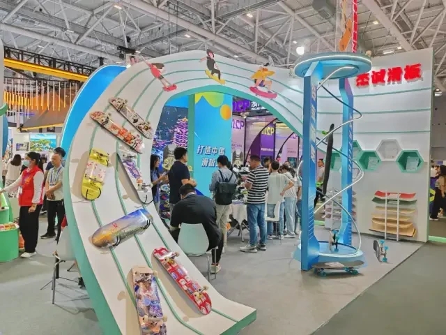 走進惠州館,以滑板賽道為創(chuàng)意設(shè)計的滑板互動體驗區(qū),備受觀眾歡迎,不少觀眾主動踏上滑板,現(xiàn)場感受滑板運動之樂。
