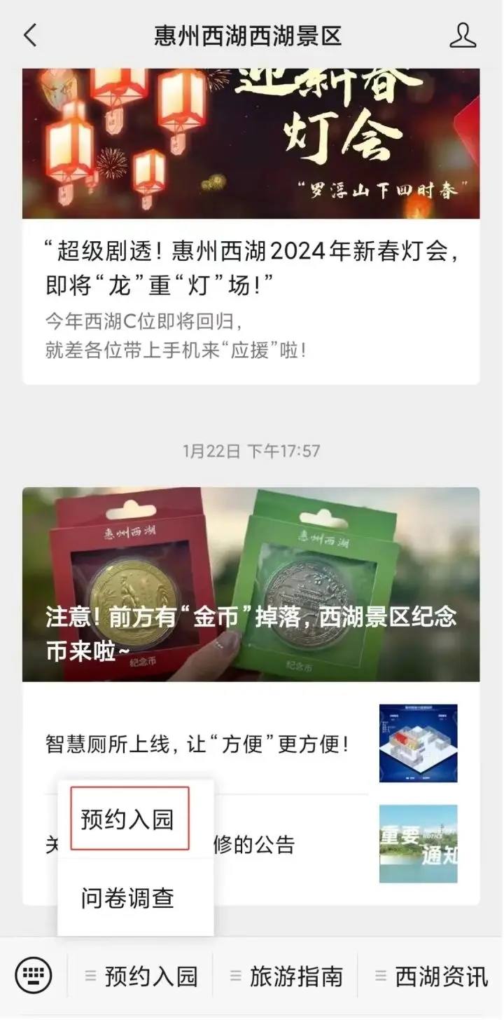 。ㄒ唬┩ㄟ^(guò)“ 惠州西湖西湖景區(qū) ”公眾號(hào)或“惠州西湖景區(qū)”小程序進(jìn)入預(yù)約界面。