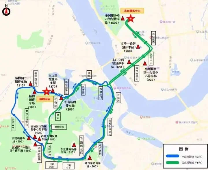去程時(shí),可將車輛停放在植物園片區(qū)(植物園停車場(chǎng)、豐山智慧停車場(chǎng)、植物園二期停車場(chǎng))、高榜山片區(qū)(高榜山停車場(chǎng)、惠城區(qū)行政服務(wù)中心停車場(chǎng)、西湖大劇院停車場(chǎng))、惠城區(qū)“一場(chǎng)三館”停車場(chǎng))、飛鵝嶺片區(qū)(東江體育場(chǎng)智慧停車場(chǎng)、老汽車站停車場(chǎng))等停車場(chǎng),在就近的公交站點(diǎn)乘坐接駁線,在豐渚園站點(diǎn)下車,步行從西湖小北門(mén)進(jìn)入,或在百花洲站點(diǎn)下車,步行從西湖東門(mén)進(jìn)入。