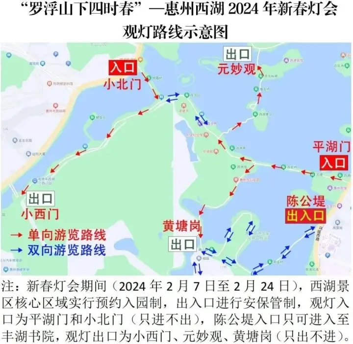(三)燈會(huì)亮燈期間出入口實(shí)行安保管制,觀燈入口為平湖門(mén)、小北門(mén)(只進(jìn)不出),陳公堤入口只可進(jìn)入至豐湖書(shū)院,觀燈出口為小西門(mén)、元妙觀、黃塘崗(只出不進(jìn)),現(xiàn)場(chǎng)指揮部根據(jù)觀燈人流情況臨時(shí)管制。