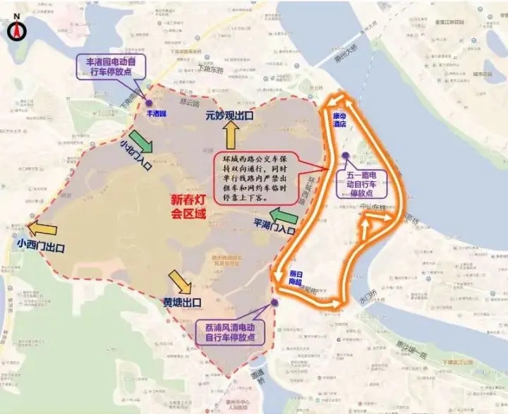 西湖新春燈會(huì)期間臨時(shí)交通管制示意圖。