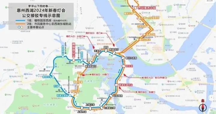 西湖新春燈會(huì)高峰期間(每日17:30至23:00),公安交警部門(mén)分別在市區(qū)江北片區(qū)市民服務(wù)中心和江南片區(qū)惠州植物園設(shè)置公交車接駁點(diǎn),環(huán)西湖周邊道路除西湖東門(mén)(平湖門(mén))、豐湖書(shū)院(麗日)公交站外,依托其他公交站設(shè)置上落客點(diǎn),建議游園觀燈游客可將車輛停放在公交接駁點(diǎn)、上落客點(diǎn)周邊的停車場(chǎng),換乘免費(fèi)接駁公交車輛往返,接駁公交車發(fā)車間隔約10分鐘/班。停車場(chǎng)對(duì)應(yīng)乘坐接駁線公交站點(diǎn)如下: