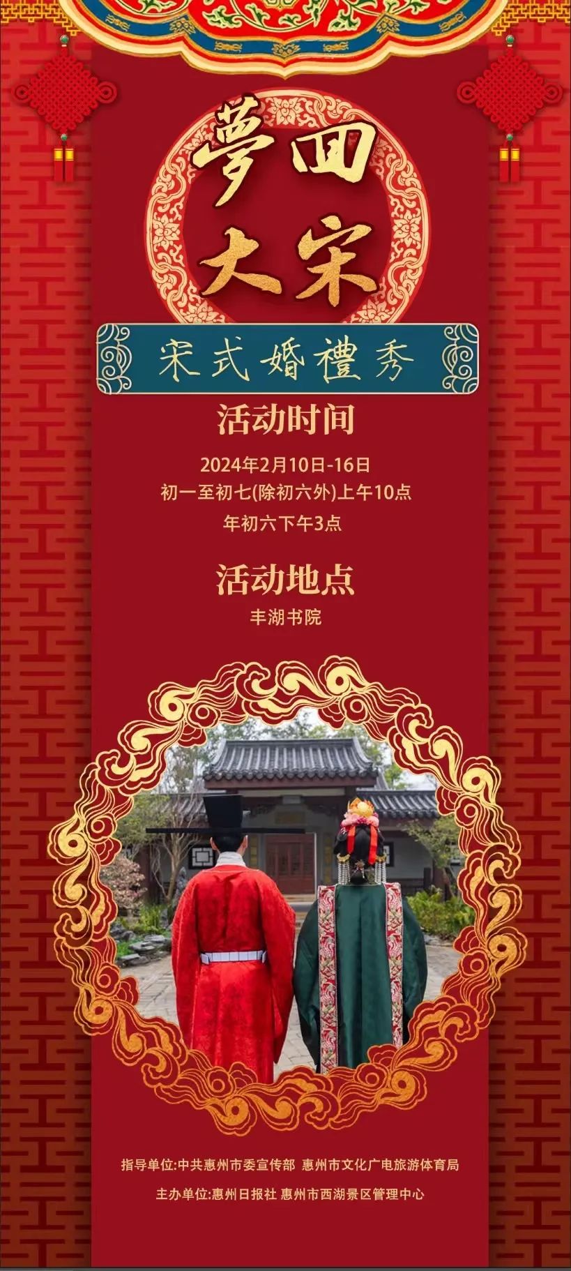 “羅浮山下四時(shí)春”——嶺南書(shū)院·豐湖書(shū)院春節(jié)主題活動(dòng),將于2月10日-2月16日(正月初一至初七)在惠州西湖景區(qū)豐湖書(shū)院舉辦。本次主題活動(dòng)分為“宋式婚禮”“宋街”兩大板塊,帶你一起夢(mèng)回大宋,在“穿越之旅”中沉浸式體驗(yàn)千年前的北宋盛況。