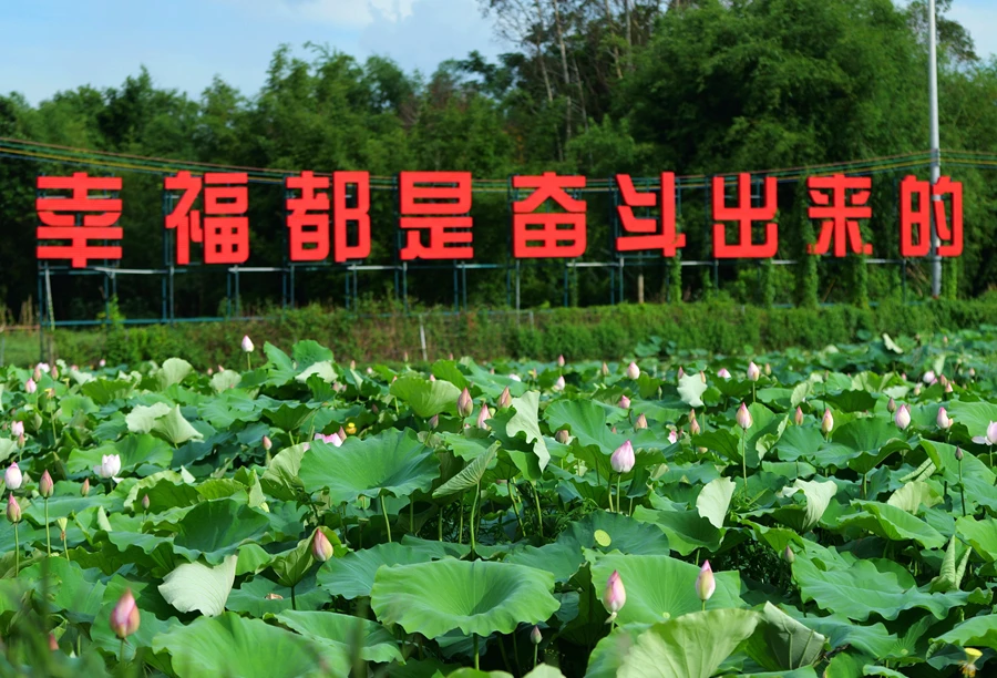 “幸福都是奮斗出來的”,顯眼紅色的大字和綠色的荷花交相輝映。三嘉村是廣東省“百千萬工程”首批典型村。