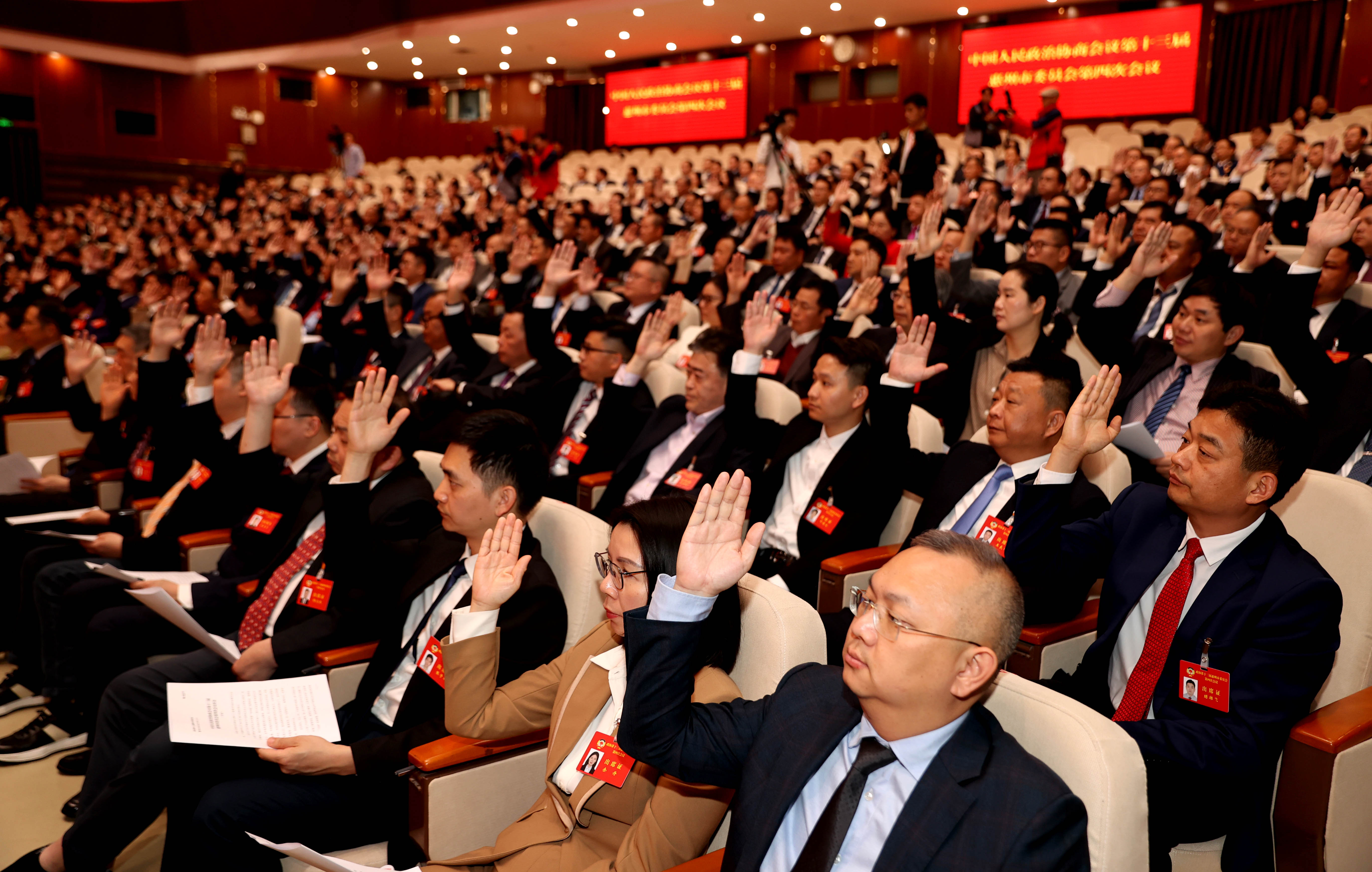 2月20日下午,參加政協(xié)第十三屆惠州市委員會第四次會議閉幕會的委員在舉手表決。 惠州日報(bào)記者李松權(quán) 攝
