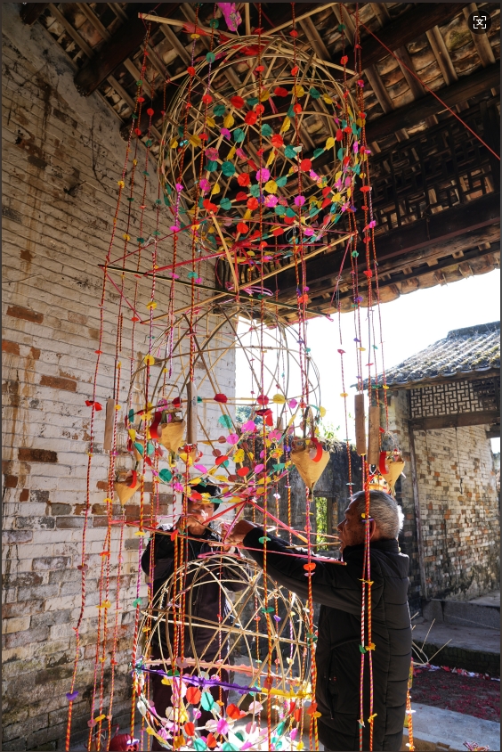 扎架、剪紙、卷燈帶、裱糊、做燈斗與鳳雞……從年初二開始,虎頭花燈非遺代表性傳承人何廖福便領(lǐng)頭,與其他村民一起,在村中祠堂制燈,分工協(xié)作,一派忙碌景象。何廖福表示,虎頭花燈看似構(gòu)造簡(jiǎn)單,但由于全燈都由人工制作,一個(gè)燈最快要一個(gè)星期才能完成。每年年初二至元宵節(jié)前,虎頭村民小組能制作出約100盞虎頭花燈。