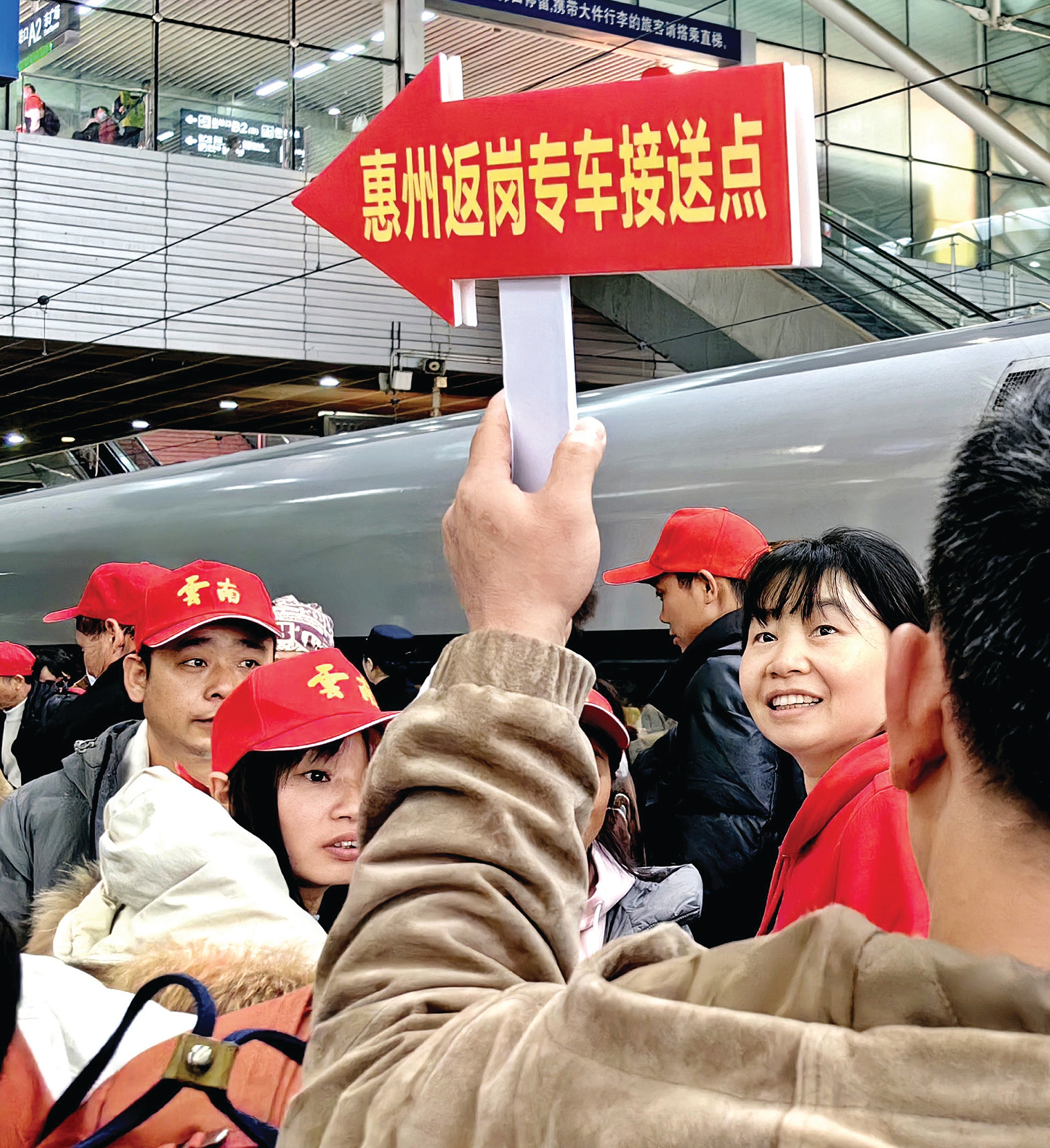惠州市人社部門(mén)工作人員在深圳北高鐵站迎接返惠務(wù)工人員。 惠州日?qǐng)?bào)記者李松權(quán) 實(shí)習(xí)生鄭昊陽(yáng) 攝