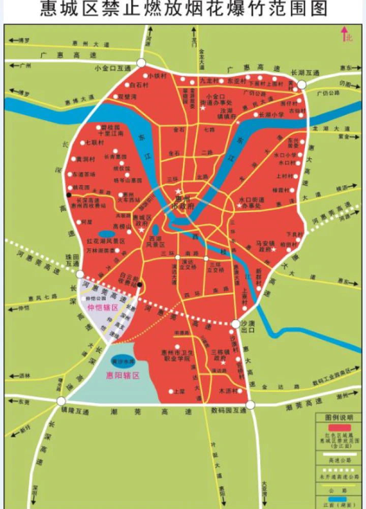 其中,惠城區(qū)禁燃區(qū)范圍,東面為惠大高速長湖互通→惠大高速→潮莞高速數碼園互通;南面為潮莞高速數碼園互通→潮莞高速→長深高速鎮(zhèn)隆互通;西面為長深高速鎮(zhèn)隆互通→長深高速→長深高速惠州支線與河惠莞高速交叉處→河惠莞高速→河惠莞高速珠田互通→長深高速→廣惠高速小金口互通;北面為廣惠高速小金口互通→廣惠高速→惠大高速長湖互通。