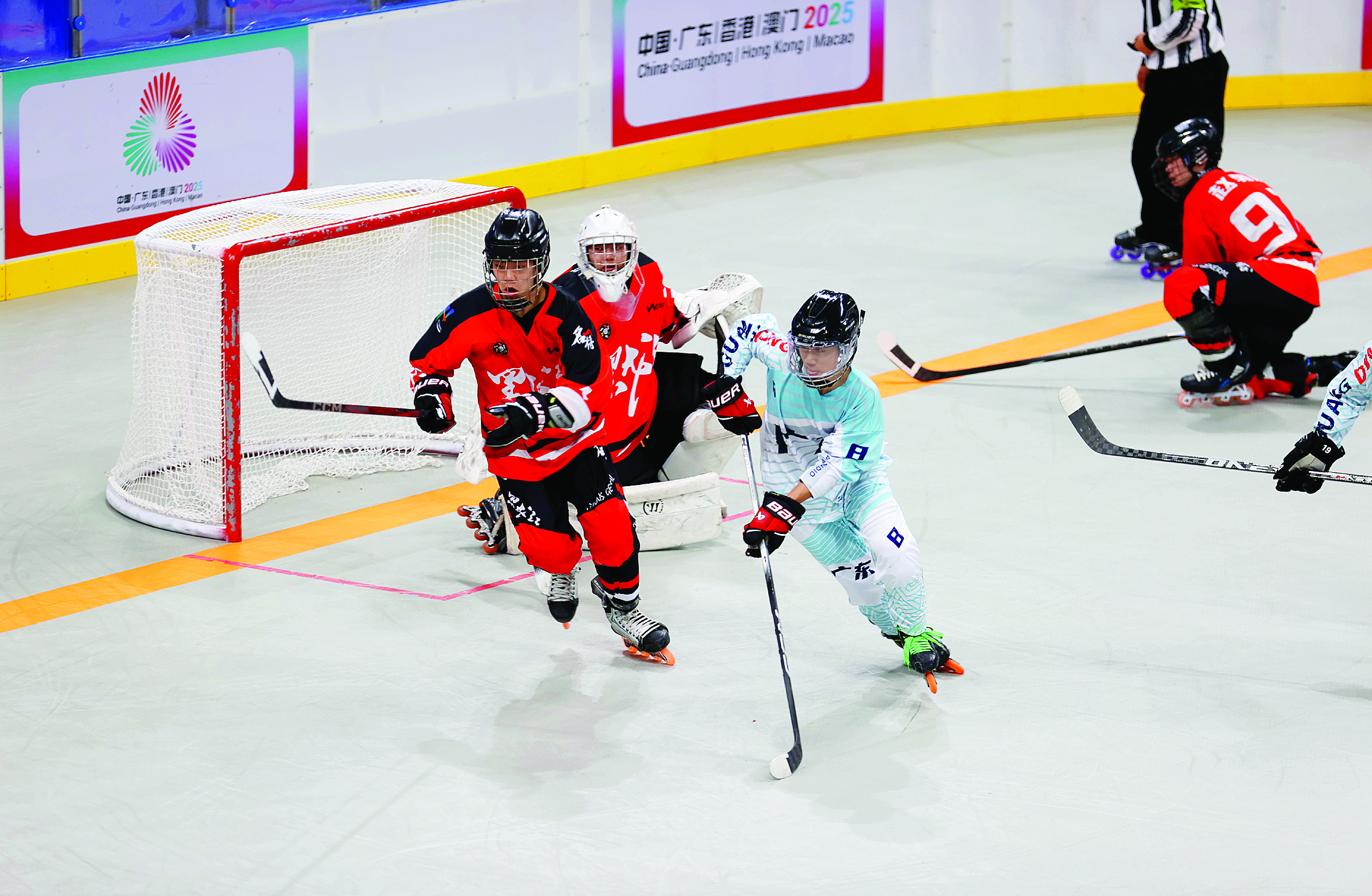 昨日的單排輪滑球比賽中,廣東男隊(duì)(藍(lán)方)4:1戰(zhàn)勝黑龍江男隊(duì);葜萑請(bào)記者楊建業(yè) 攝