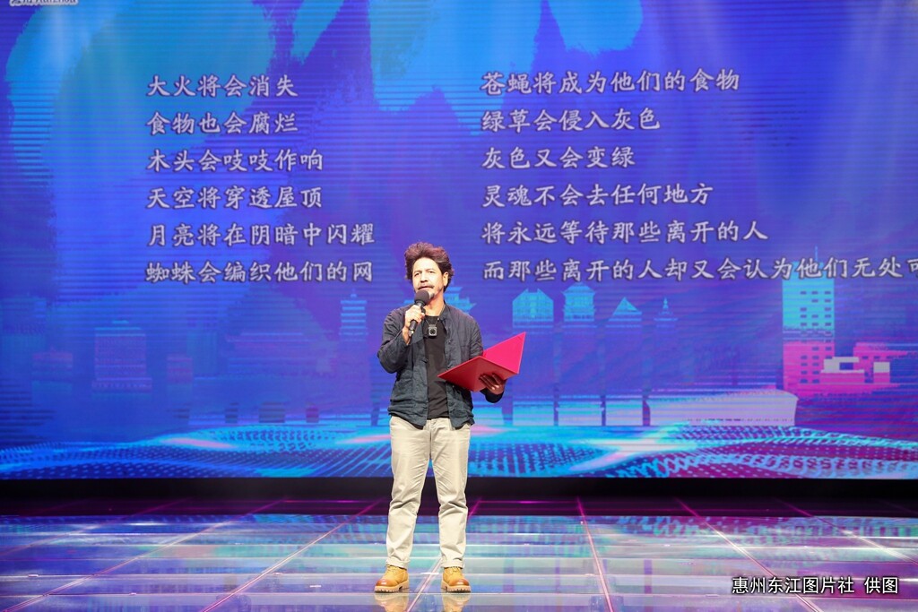 1月13日晚,青春詩會四十屆座談會暨“青春詩城”系列活動之“永遠(yuǎn)的青春”詩歌朗誦會舉行,吉狄馬加、王山、楊克等參會詩人現(xiàn)場吟誦自己創(chuàng)作的青春詩篇,惠州本地專業(yè)主持人、朗誦家也共同參與朗誦“青春詩會”走出的著名詩人的經(jīng)典名篇。朗誦會輔以音樂等形式,融合新媒體技術(shù),呈現(xiàn)出詩樂相配的精彩畫面,給觀眾帶來審美愉悅和心靈震撼。