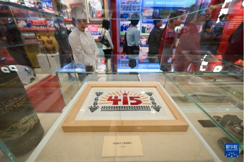 這是展覽上展示的納西族手工刺繡擺臺(4月15日攝)。新華社記者 李鑫 攝