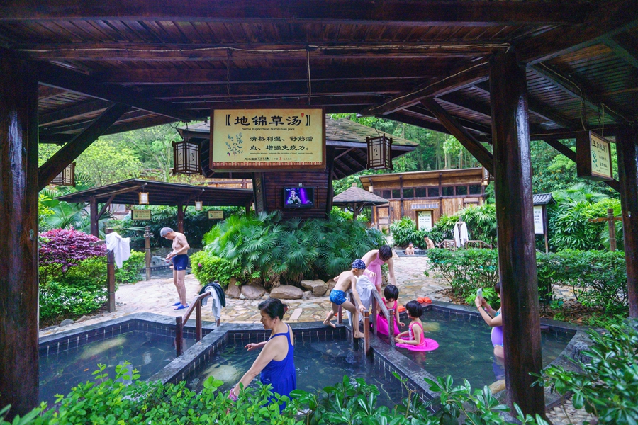 惠州溫泉資源豐富,擇一溫泉?jiǎng)俚兀瑤先搴糜,在綠樹環(huán)繞的溫泉池里泡溫泉,無比愜意。