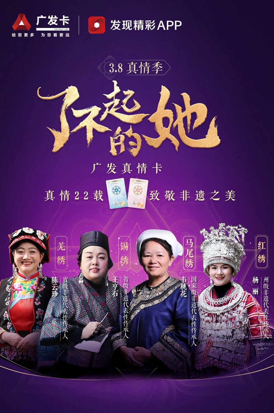 作為國內首張女性專屬信用卡,廣發(fā)真情卡專注陪伴女性成長22年,一直致力于發(fā)現(xiàn)、看見、傳播更多的“她力量”,幫助更多的中國女性追夢逐夢圓夢。3月8日是“國際勞動婦女節(jié)”,廣發(fā)真情卡攜手中國婦女發(fā)展基金會“天才媽媽”公益項目,聚焦于非遺的匠心獨運,著眼于民族錦繡中蘊含的東方美,以真情致敬非遺之美,通過講述非遺傳承人故事,致敬每一位了不起的她。