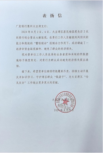 惠州市大亞灣區(qū)反詐中心近日向廣發(fā)銀行惠州大亞灣支行發(fā)出表揚信,以表彰支行在近期成功防范一起涉詐資金取現(xiàn)事件中的出色表現(xiàn)。
