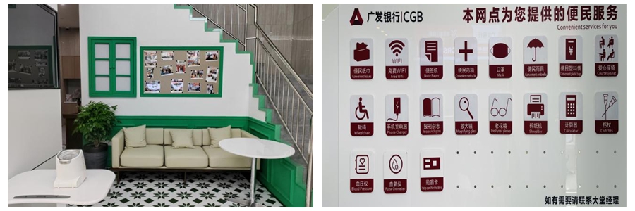 老有所得,適老改造增特色。堅持以人為本,不斷在硬件設施的功能性、實用性、針對性上下功夫,一是升級網(wǎng)點設施,為行動不便的老年人設置無障礙通道、無障礙衛(wèi)生間,配備輪椅、拐杖、放大鏡、不同度數(shù)老花鏡、血壓血氧計、便民藥箱等適老化便民設施;二是打造服務專區(qū),廣泛調(diào)研長者客戶喜聞樂見的專區(qū)物件與配色布局,長者服務專區(qū)整體為懷舊設計,通過物件配置與空間改裝形成特色功能區(qū),長者客戶可在長者服務專區(qū)結伴閑坐聊天、享受自助閱讀、免費測量血壓、瀏覽活動趣聞等,感受到賓至如歸的舒適體驗。
