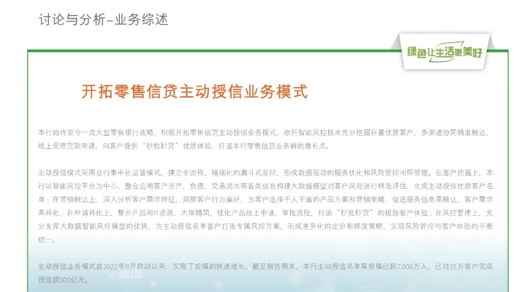 在零售風控領域,該行研發(fā)主動授信模式,深度挖掘優(yōu)質存量客戶,提供秒批秒貸服務,實現(xiàn)風險管控與客戶體驗的平衡統(tǒng)一;推進零售信貸自動化審批,降低分支機構信貸審批人員工作量一半以上,穩(wěn)步提升客戶質量。