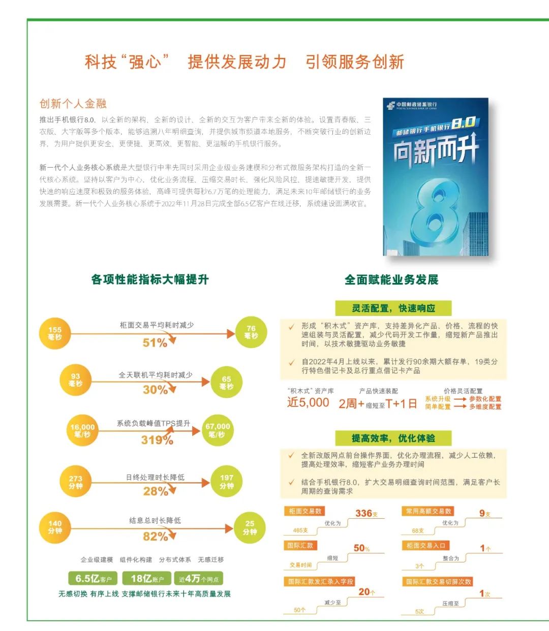 2022年,郵儲銀行新一代個人業(yè)務核心系統(tǒng)全面上線,從IT基礎設施、系統(tǒng)軟件、企業(yè)級技術平臺、應用軟件全層面全體系,從業(yè)務創(chuàng)新、系統(tǒng)研發(fā)、生產運營全過程全周期,實現(xiàn)關鍵技術自主可控,同時也是大型銀行中率先同時采用企業(yè)級業(yè)務建模和分布式微服務架構打造的全新一代核心系統(tǒng)。