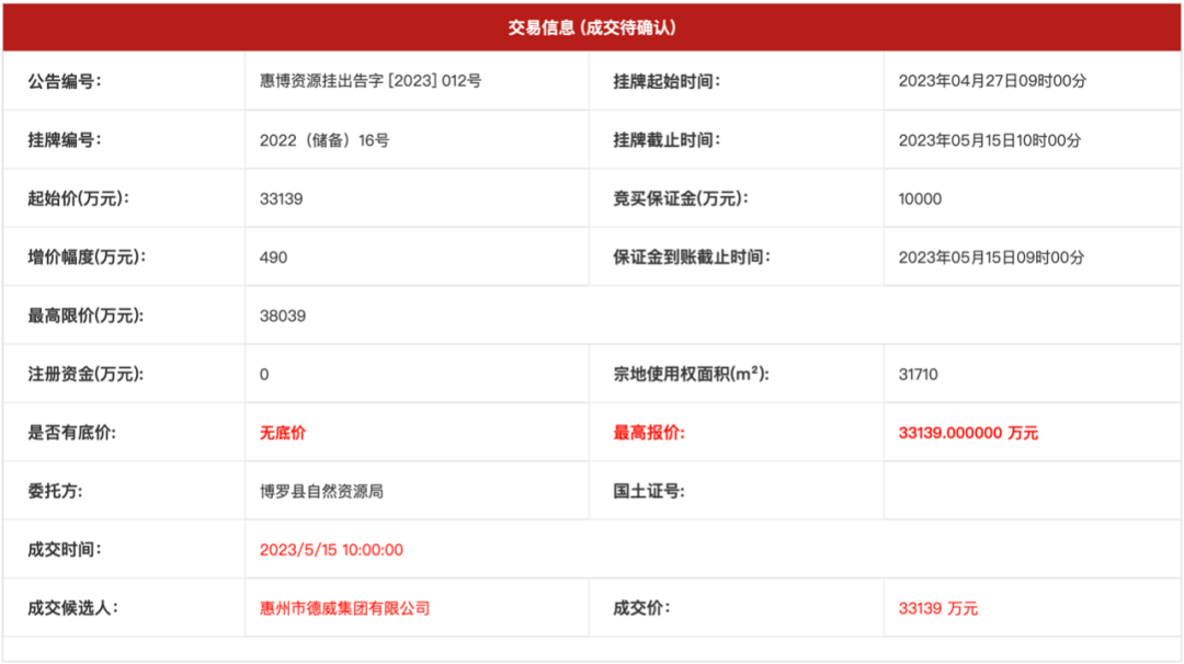 根據(jù)交易公告信息顯示,此次成交的博羅石灣2022(儲(chǔ)備)16號(hào)地塊,宗地使用權(quán)面積31710㎡,計(jì)容積率建筑面積69762㎡【其中商業(yè)建筑面積占比≤3%,社區(qū)公共服務(wù)用房建筑面積≥600㎡(含養(yǎng)老設(shè)施服務(wù)用房,按每百戶不低于20㎡且套內(nèi)不小于100㎡)】,容積率≤2.2,建筑層數(shù)≤26層,建筑高度<80米,綠地率≥35%。該地塊所建商品住房單套毛坯住房銷售價(jià)不高于14000元/㎡,競(jìng)得人須按《關(guān)于印發(fā)<惠州市自然資源局 惠州市教育局關(guān)于惠州市住宅項(xiàng)目配套教育設(shè)施建設(shè)管理辦法(試行)>的通知》(惠市自然資函〔2021〕326號(hào))文件精神,捐贈(zèng)997.1724萬(wàn)元用于教育設(shè)施建設(shè)。競(jìng)得人應(yīng)在辦理地塊規(guī)劃報(bào)建手續(xù)前完善捐贈(zèng)手續(xù)。此外,競(jìng)得人開發(fā)投資總額不少于55000萬(wàn)元(不含地價(jià)溢價(jià)部分)。