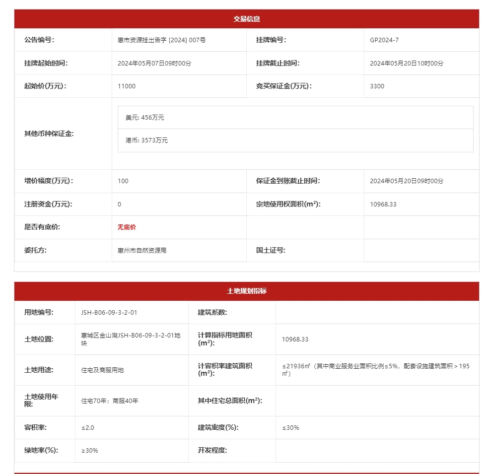 值得一提的是,公告信息顯示,該地塊建筑密度≤30%,綠地率≥30%,開發(fā)投資總額不少于18000萬元,須落實“交房即發(fā)證”有關(guān)要求。同時,鼓勵競買企業(yè)建設(shè)高品質(zhì)綠色健康住宅,打造“惠州綠色低碳示范項目”。