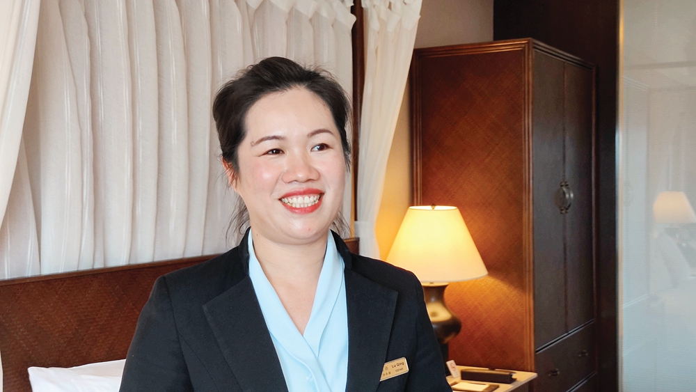 臨近中午,陸續(xù)有客人退房,新客人入住,陸清開始忙碌起來。她身著工裝、手持對講機,穿梭于各樓層客房,抽查房間整理情況,督導員工規(guī)范操作、解答客人詢問。從臉上的笑容和嫻熟的動作可以看出她對工作的專注和熱愛。