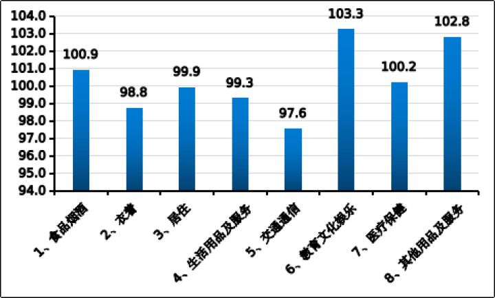 其中,食品價格上漲0.4%,服務價格上漲1.4%,非食品價格上漲0.2%,工業(yè)品價格下降1.9%,消費品價格下降0.5%。