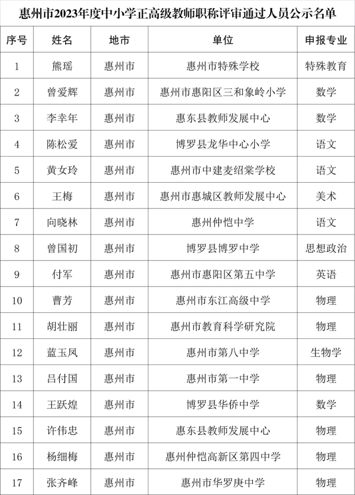 4月2日,廣東省教育廳發(fā)布了2023年度中小學(xué)正高級(jí)教師職稱(chēng)評(píng)審?fù)ㄟ^(guò)人員公示名單,惠州共有19人申報(bào)中小學(xué)正高級(jí)教師職稱(chēng),有17名教師擬獲評(píng)正高級(jí)教師職稱(chēng),通過(guò)率89.47%,獲評(píng)數(shù)量及通過(guò)率均再次突破。