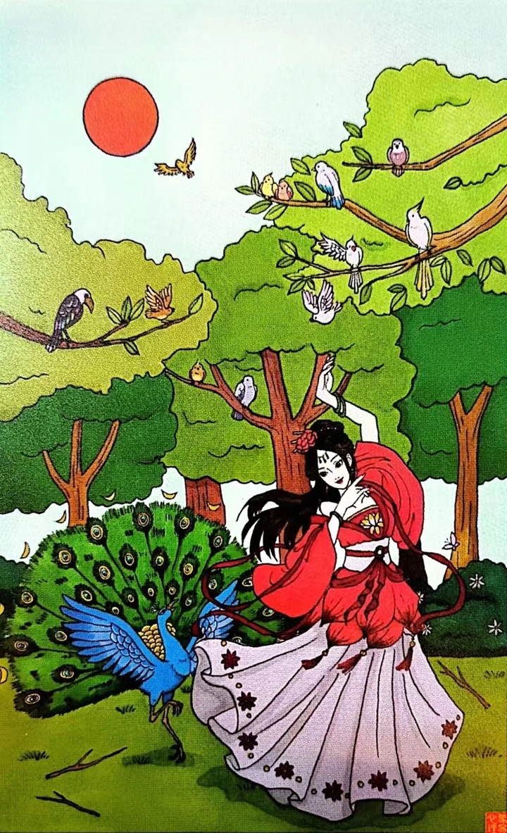 一個美麗的女孩在大自然中跳舞,旁邊有很多的小動物。