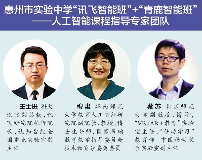 學(xué)校還特聘科大訊飛副總裁、訊飛研究院執(zhí)行院長(zhǎng)、認(rèn)知智能全國(guó)重點(diǎn)實(shí)驗(yàn)室副主任王士進(jìn);華南師范大學(xué)教育人工智能研究院副院長(zhǎng)、教授、博士生導(dǎo)師,國(guó)家基礎(chǔ)教育教學(xué)指導(dǎo)委員會(huì)技術(shù)教育分委會(huì)委員穆肅;北京師范大學(xué)副教授、博士生導(dǎo)師,“VR/AR+教育”實(shí)驗(yàn)室主任,“移動(dòng)學(xué)習(xí)”教育部-中國(guó)移動(dòng)聯(lián)合實(shí)驗(yàn)室副主任蔡蘇為學(xué)校的指導(dǎo)專家。