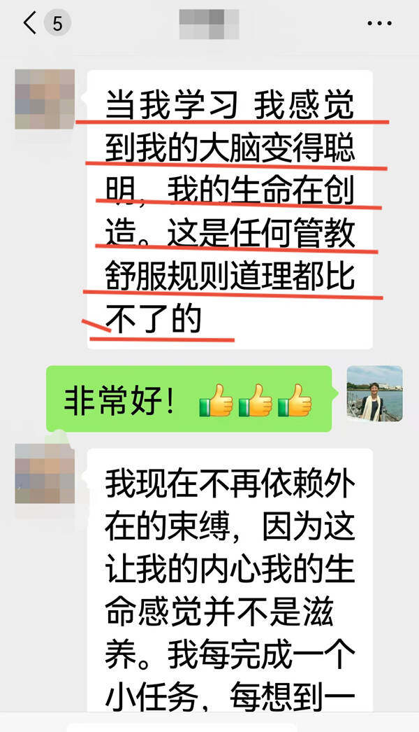 “最近我對學(xué)習(xí)狀態(tài)進(jìn)行了深入的反思、學(xué)習(xí)和思考。踐行書上的方法一段時間后,我發(fā)現(xiàn)比之前你教我的方法更加進(jìn)階。你教我后,我從厭學(xué)到喜歡學(xué);現(xiàn)在是積極地、更加有動力地去學(xué)。現(xiàn)在當(dāng)我學(xué)習(xí)時,我感覺到我的大腦變得聰明,我的生命在創(chuàng)造,這是任何管教、規(guī)則、道理都比不了的!辈痪们,在國外讀研究生的學(xué)員雅(化名)與學(xué)競分享了她的變化及最近的學(xué)習(xí)心得。
