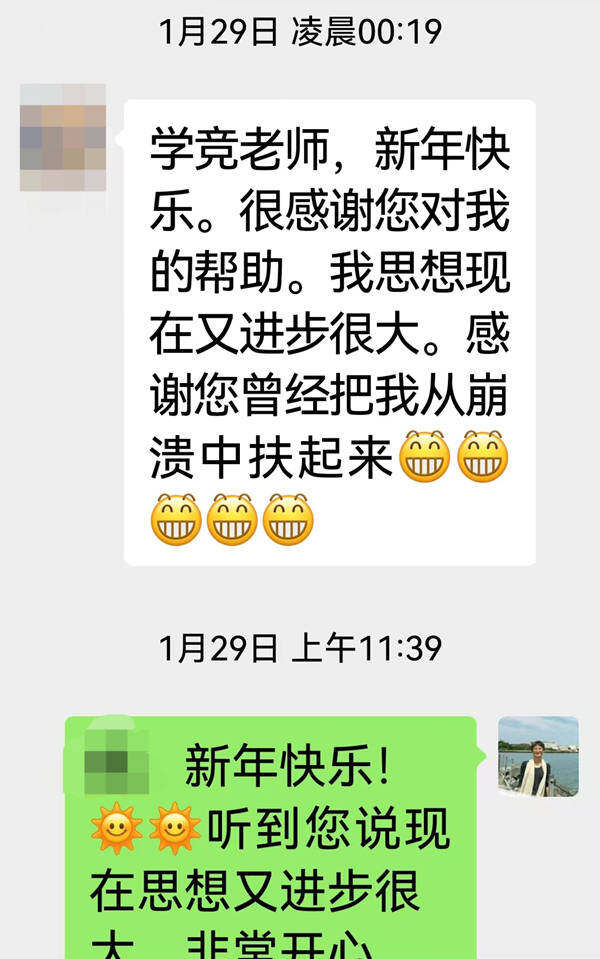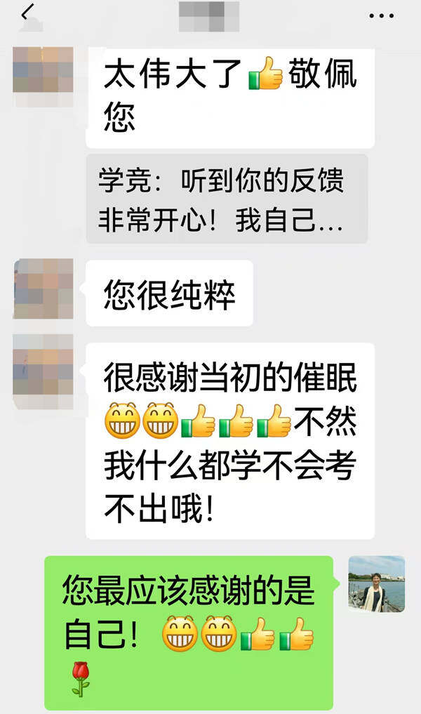 “在找你之前,我學(xué)習(xí)很差,只考了專科,經(jīng)常哭泣。學(xué)習(xí)這件事讓我很害怕,很煩,不知道該怎么辦。找你做了催眠后,這些都改變了。我現(xiàn)在留學(xué)讀研究生,每個學(xué)期都有一科要閉卷考試,全部要用筆寫英文問答。爸爸知道我學(xué)習(xí)很差,英語又不是很好,擔(dān)心我考不過。但是我都過了,沒有掛科。對我來說,這是個很大的進(jìn)步,以前我都不敢想這些事情。”