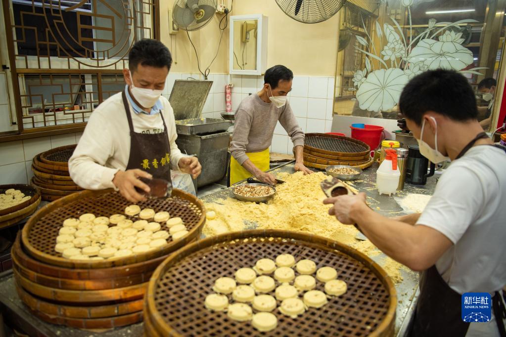 1月18日,澳門“最香餅家”員工在制作手工炭燒杏仁餅。新華社記者 張金加 攝