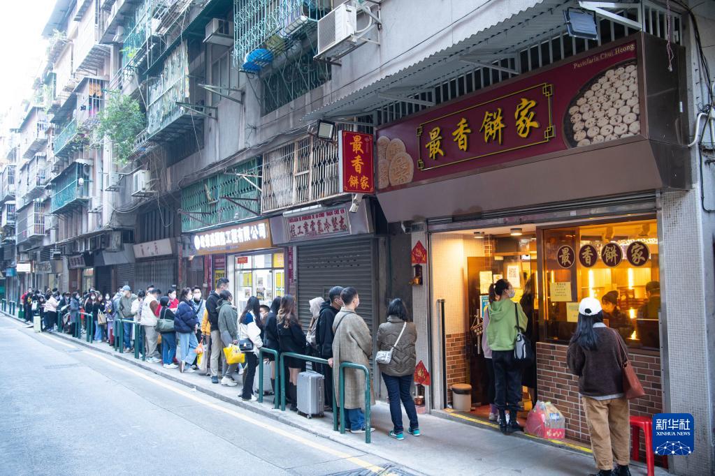 1月18日,游客在澳門“最香餅家”店外排隊購買手工炭燒杏仁餅。新華社記者 張金加 攝