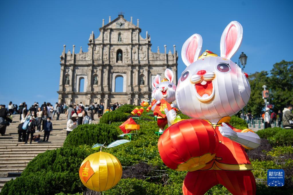 大三巴、官也街、媽閣廟……澳門的熱門旅游地標(biāo)處水泄不通。大三巴牌坊前,五只身穿賀年服飾的“玉兔”迎客,與牌坊互相輝映,參觀的人群幾乎站滿了每級臺階。
