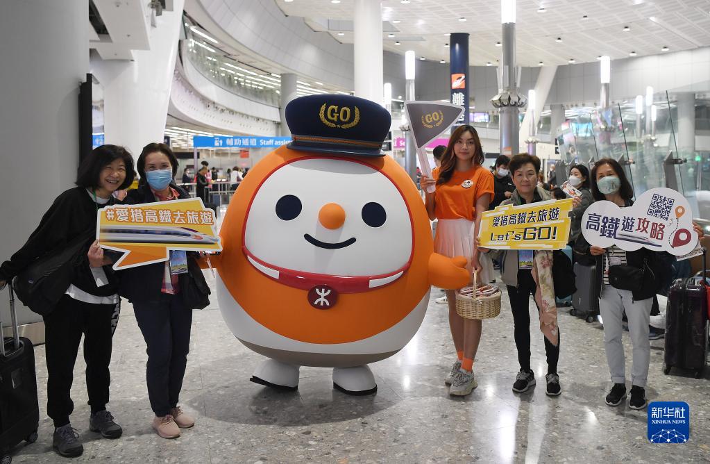 4月1日,在香港高鐵西九龍站,旅客與高鐵吉祥物“高鐵隊(duì)長(zhǎng)”合影。新華社記者陳鐸攝
