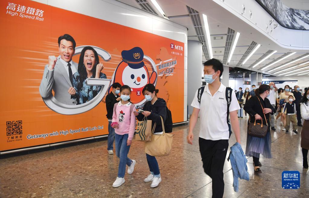 4月1日,從內(nèi)地搭乘跨省長(zhǎng)途列車(chē)抵港的旅客走出香港高鐵西九龍站。新華社記者陳鐸攝