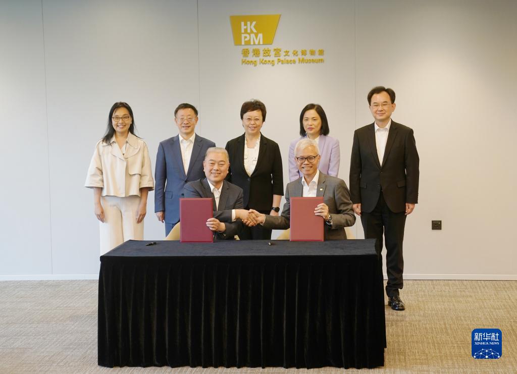 5月22日,在香港故宮文化博物館,四川省文物考古研究院院長唐飛(前左)代表廣漢三星堆博物館、成都金沙遺址博物館、四川省文物考古研究院及成都文物考古研究院,與香港故宮文化博物館館長吳志華共同簽署展覽意向合作協(xié)議。新華社記者 王申 攝
