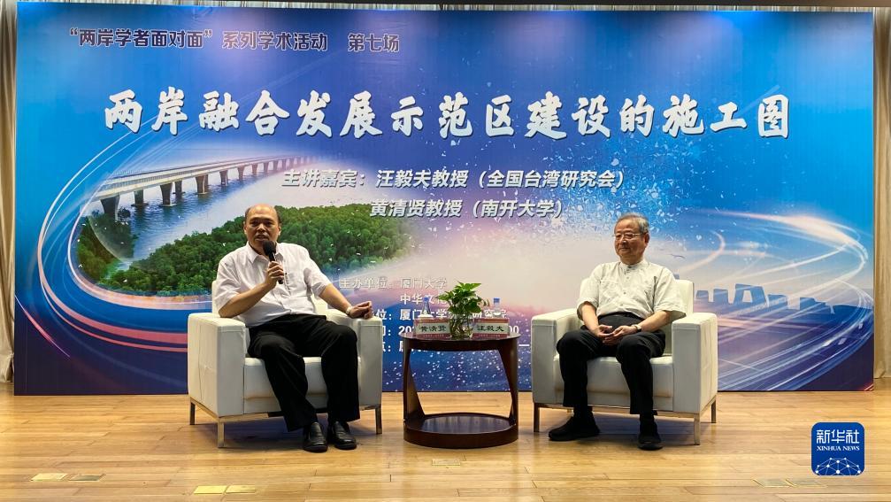 9月26日,全國(guó)臺(tái)灣研究會(huì)會(huì)長(zhǎng)汪毅夫與南開(kāi)大學(xué)周恩來(lái)政府管理學(xué)院行政管理系教授黃清賢以“兩岸融合發(fā)展示范區(qū)建設(shè)的施工圖”為主題在廈門(mén)大學(xué)開(kāi)展對(duì)談。新華社記者 顏之宏 攝