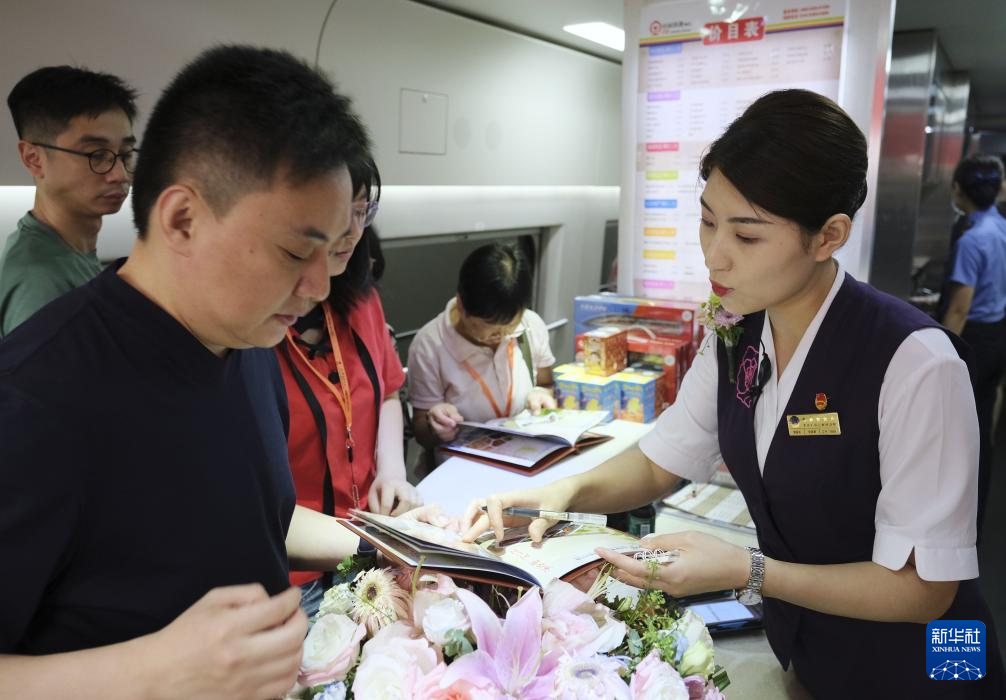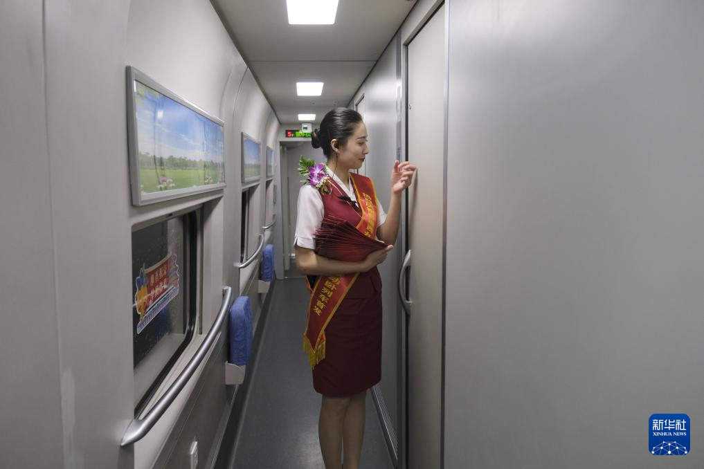 D910次列車乘務(wù)員準(zhǔn)備向包廂內(nèi)的旅客發(fā)放紀(jì)念品(6月15日攝)。新華社記者 王申 攝