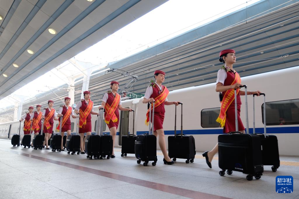 6月16日,D910次列車乘務(wù)員列隊(duì)經(jīng)過(guò)北京西站站臺(tái)。新華社記者 王申 攝