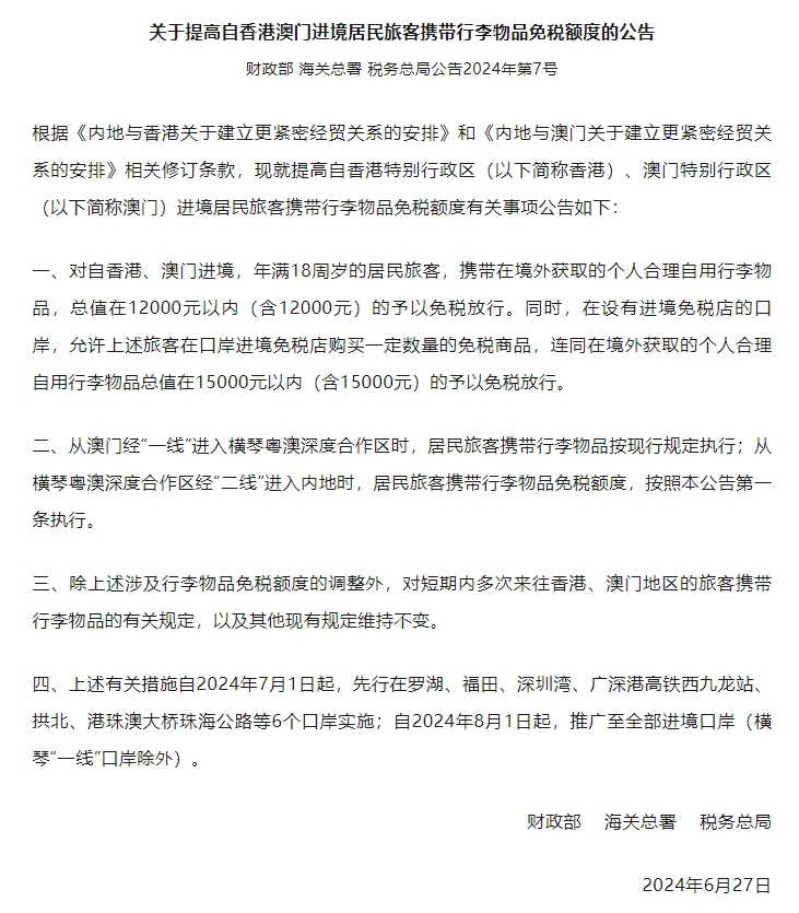 商務部28日對外公布,內地與香港、內地與澳門在《關于建立更緊密經貿關系的安排》(CEPA)機制下經過磋商,同意提高自香港、澳門進境居民旅客攜帶行李物品免稅額度,相關內容納入《CEPA貨物貿易協(xié)議》。具體措施由業(yè)務主管部門對外公布實施。
