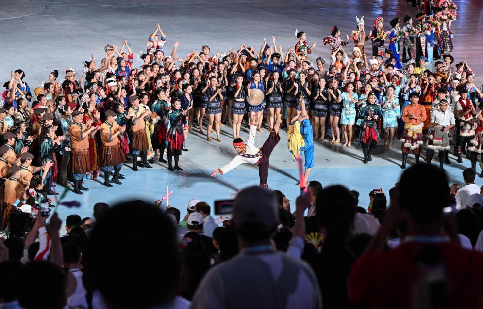 新華社三亞11月26日電(記者馬思嘉、嚴(yán)鈺景)天涯海角,椰風(fēng)陣陣。第十二屆全國少數(shù)民族傳統(tǒng)體育運(yùn)動(dòng)會(huì)民族大聯(lián)歡活動(dòng)26日在三亞舉行。身著不同民族服飾的年輕人夾道歡迎天南海北的來客。在喧騰的樂聲中,各族同胞載歌載舞,交換禮物,結(jié)識朋友,在大聯(lián)歡、大團(tuán)圓中留下難忘回憶。