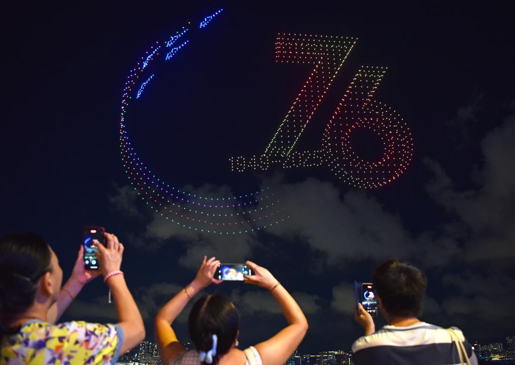 10月2日,香港舉行大型無人機匯演,慶祝中華人民共和國成立76周年。新華社記者 陳鐸 攝