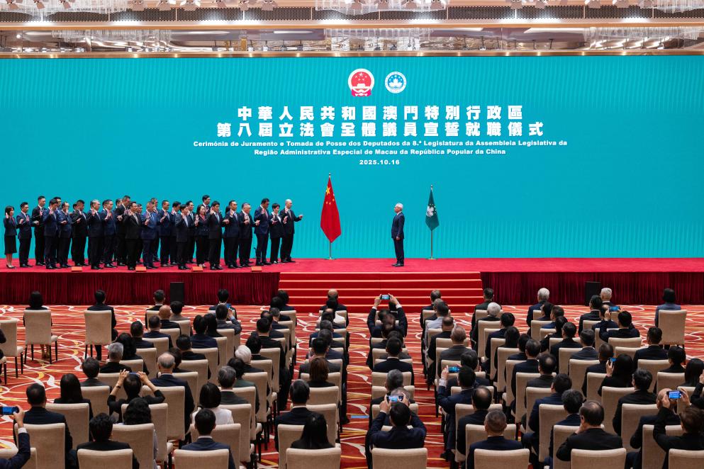 10月16日,在澳門特區(qū)行政長官岑浩輝(右一)監(jiān)誓下,澳門特區(qū)第八屆立法會議員宣誓就職。新華社發(fā)(張金加 攝)