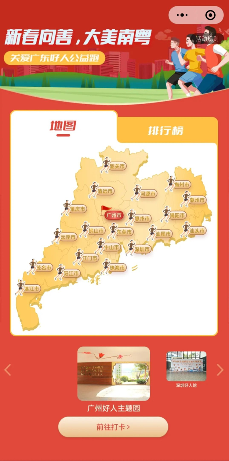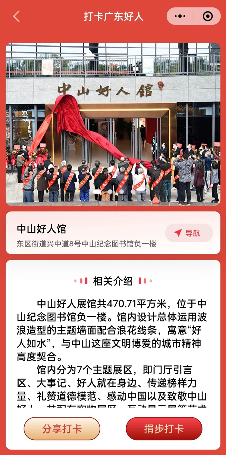 通過首頁地圖,點擊下方“前往打卡”進入各地市好人館、好人長廊和好人公園等詳情頁,查看照片、簡介、地址等基本資料。