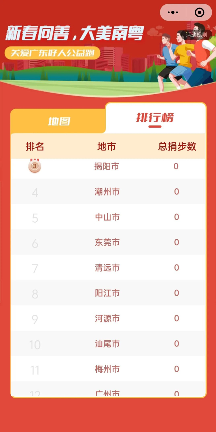 選擇“捐步打卡”可以捐出當天微信運動步數(shù)(需打開“微信運動”功能),完成打卡后可獲得一次抽獎機會,在首頁“排行榜”可看到各地市累計捐步總數(shù)。