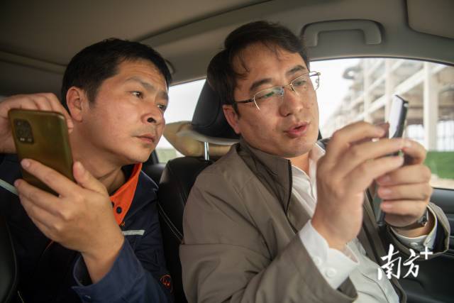 呂崇君在車上與項目方相關負責人協(xié)調(diào)解決施工過程中遇到的問題。南方日報記者 徐昊 攝