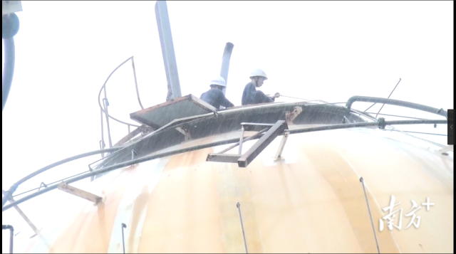 到達(dá)第一個(gè)罐體底部后,張志添搬來(lái)竹梯,緩緩登向罐頂!爱(dāng)時(shí)風(fēng)力巨大,我是爬一節(jié)滑一節(jié),然后繼續(xù)爬,那是我人生中最長(zhǎng)的20米,足足爬了半個(gè)多小時(shí)!痹20多米的高空、不足2平米的操作平臺(tái)、強(qiáng)達(dá)5至6個(gè)大氣壓的泄漏壓力,導(dǎo)致人難以站穩(wěn),但張志添保持冷靜,沉穩(wěn)操作,按照預(yù)先的方案展開(kāi)堵漏。