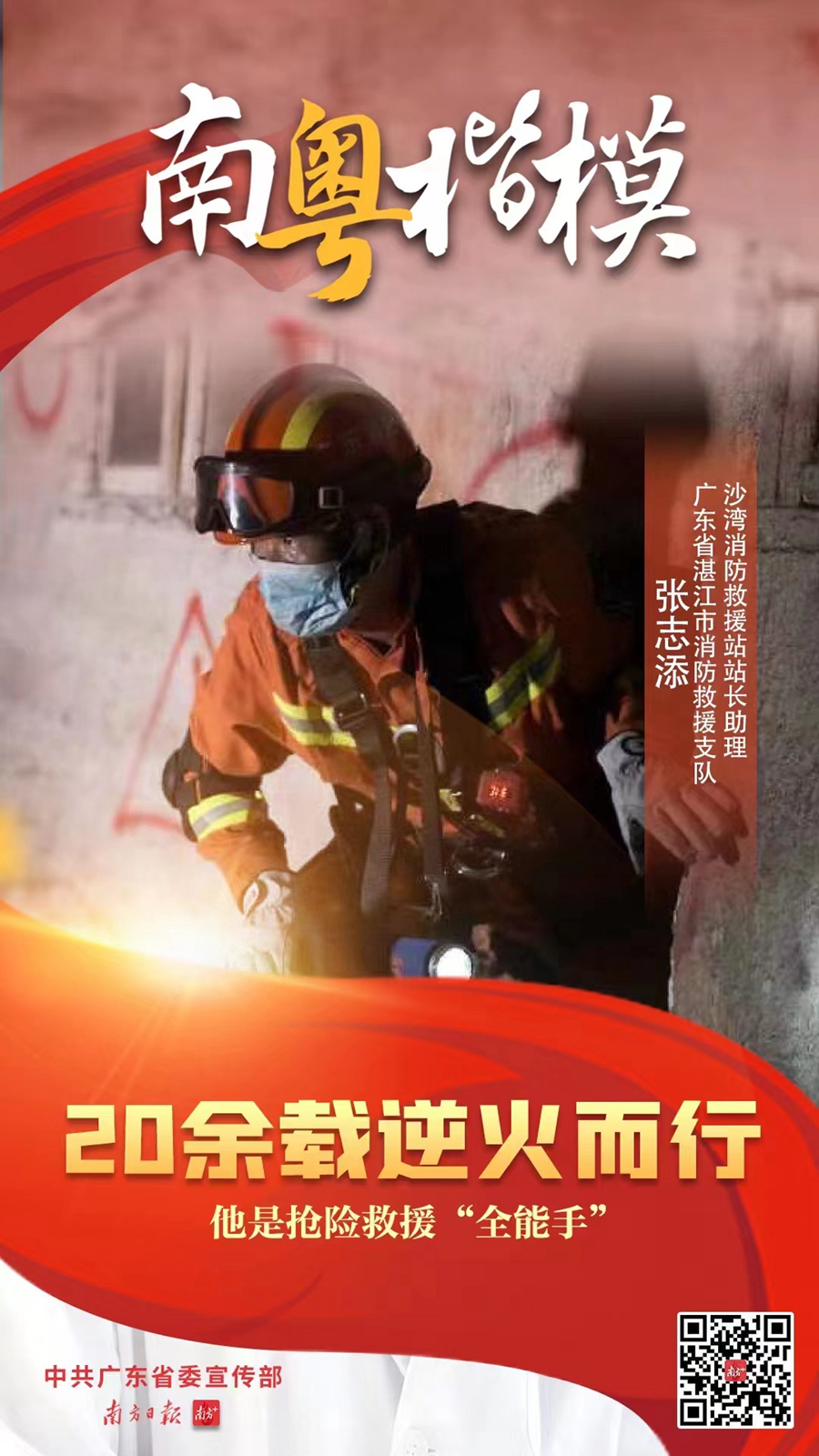 張志添個(gè)子不高,臉龐黝黑,眼睛里時(shí)常透露出堅(jiān)毅。他是廣東消防救援隊(duì)伍中公認(rèn)的“消防鐵教頭,駐地守夜人”,在隊(duì)友印象中,他不是在救援現(xiàn)場(chǎng),就是在去現(xiàn)場(chǎng)的路上;在兒子的作文里,他是經(jīng)歷過(guò)風(fēng)雨,平凡又偉大的英雄;而在自己心中,他只是全國(guó)消防隊(duì)伍的一分子,一顆扭在基層一線的“螺絲釘”,只要在崗一分鐘,自己就會(huì)鉚足勁鉆下去。近日,他獲授“南粵楷!狈Q號(hào)。